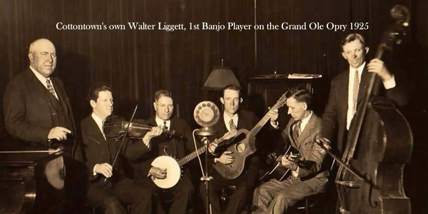 In 1916, LIGGETT started a produce peddling route in Cottontown, using one horse to alight wagon. Later he advanced to a two-horse wagon. The wagon this scribe can remember was pulled by a team of small white mules. He kept a brass bugle, on the seat beside him, that he blew to alert the customers that he was near their house. Everyone was a friend to him; he laughed easily, was very jolly, and would crow like a rooster for us kids. If the truth were known, he gave away as much candy as he sold. He had a route for each day of the week except Friday. This day was set aside to haul the eggs, chickens, hams and calves to market that he had either bought or traded groceries for during the week. He hauled this load to Nashville on a solid rubber tired, snub-nosed Mack truck. His son, Leonard, recalled to me that his daddy played his banjo for nearly every square dance in the county.“ The Gallatin News-Examiner Wednesday, April 18, 1979. By David Collier.